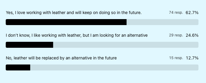 It sometimes feels like we have to persuade people that leather is the more sustainable option, over all those vegan alternatives. But we were curious to find out how Alcova visitors perceive leather in comparison to alternatives. 62% were very positive and intends to keep on working with leather. We like that outcome!